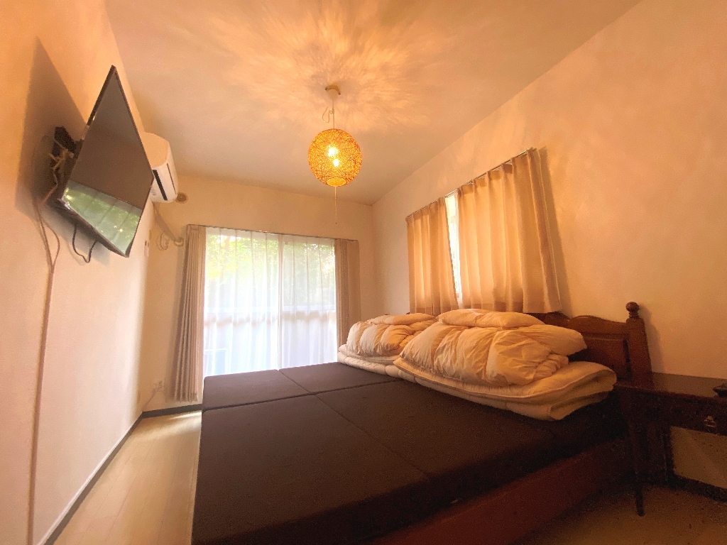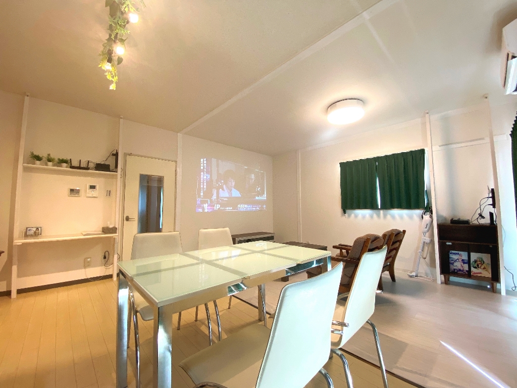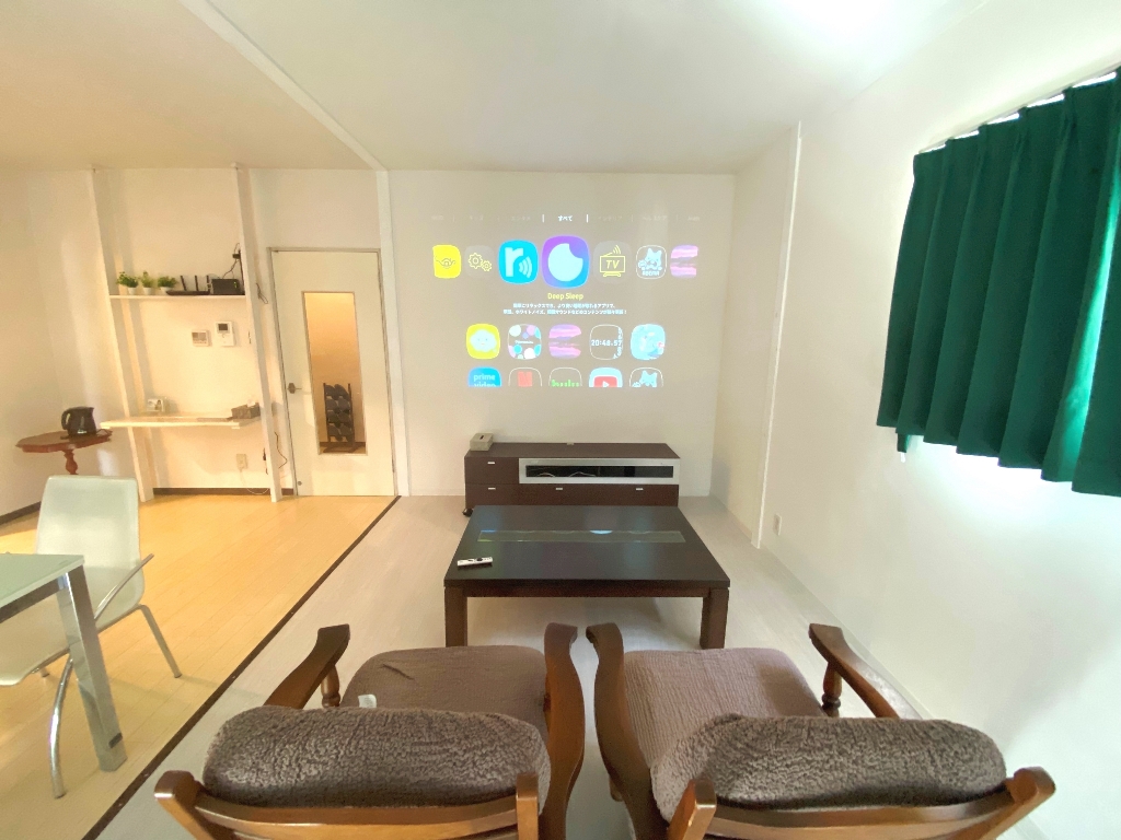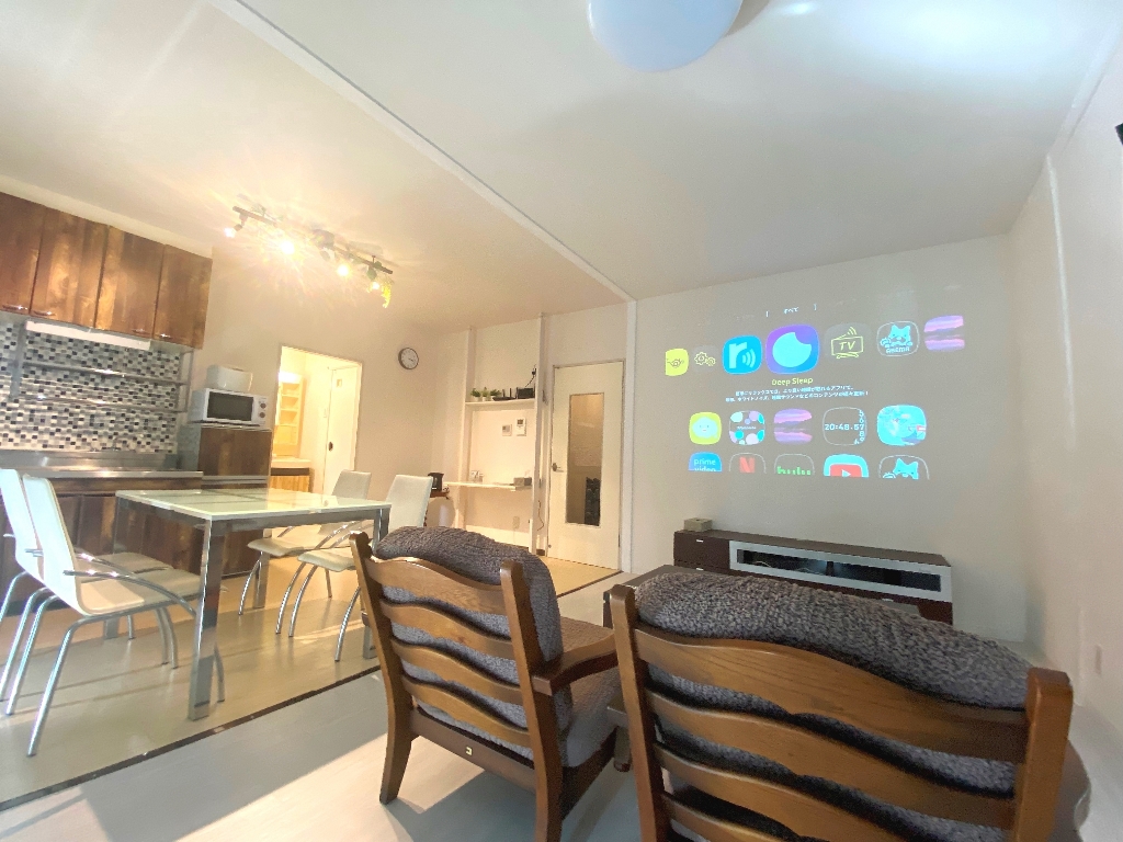 そして、このお部屋の一番の遊び心は、白い壁へプロジェクターが投影できるようにしてみました。せっかくマンスリーでのお時間を過ごしていただくのに、自宅では味わえないような楽しみを感じていただきたく、設置をしています。