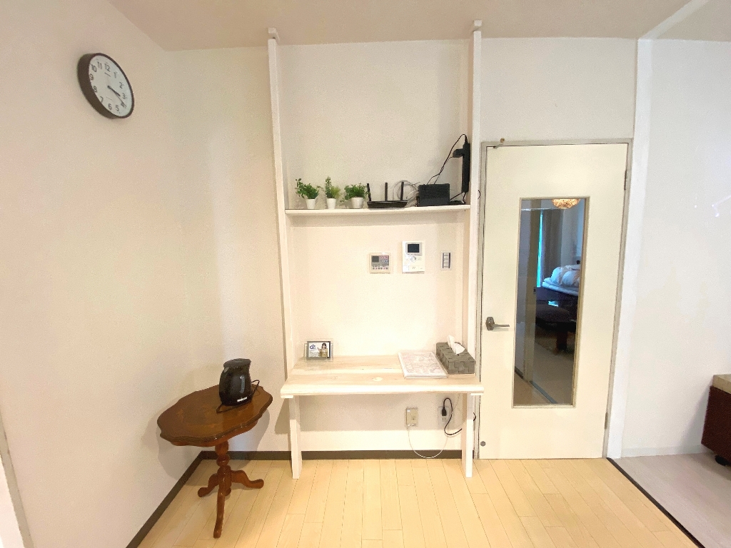 最近はマンスリーを借りられる方が海外からの帰国待機の方が非常に多いため、在宅ワーク用にWi-Fi環境の近くに在宅ワーク用のデスクも自作を行いました。テーブルを置くと狭くなるため、2×4材で天井と床を突っ張るようにして固定してみました。