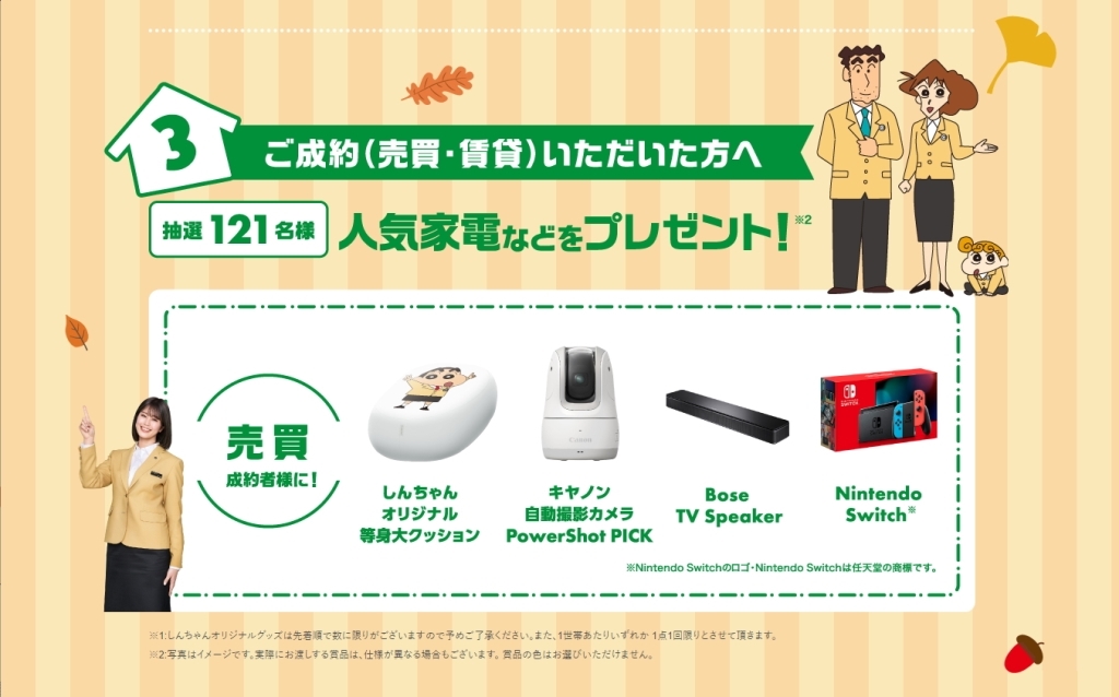 - キャンペーン期間(2022年8月27日~2022年11月6日)中にセンチュリー21加盟店にて成約いただき本キャンペーンサイトから応募された方を対象に、抽選で下記プレゼントが当たるキャンペーンです。