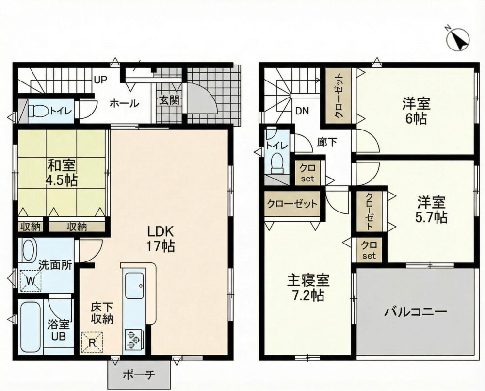| 間取内容 | LDK17畳 1階 和室4.5畳 1階 洋室7.2畳 2階 洋室6畳 2階 洋室5.7畳 2階 | ||