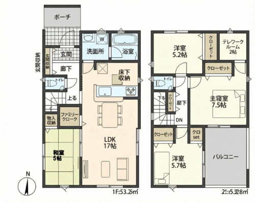 間取内容 LDK17畳 1階   和室5畳 1階   洋室7.5畳 2階   洋室5.7畳 2階   洋室5.2畳 2階   洋室2畳 2階
