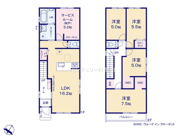 | 間取内容 | LDK16.2畳 1階 S5.2畳 1階 洋室7.5畳 2階 洋室5.5畳 2階 洋室5畳 2階 洋室5畳 2階 | ||