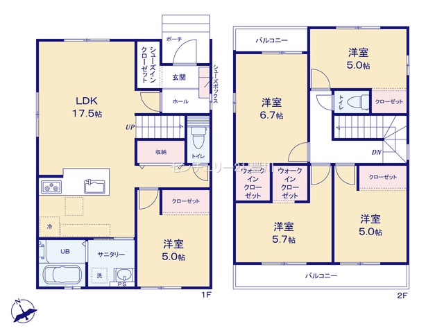 | 間取内容 | LDK17.5畳 1階 洋室5畳 1階 洋室6.7畳 2階 洋室5.7畳 2階 洋室5畳 2階 洋室5畳 2階 | ||