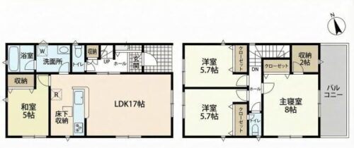 | 間取内容 | LDK17畳 1階 和室5畳 1階 洋室8畳 2階 洋室5.7畳 2階 洋室5.7畳 2階 S2畳 2階 | ||