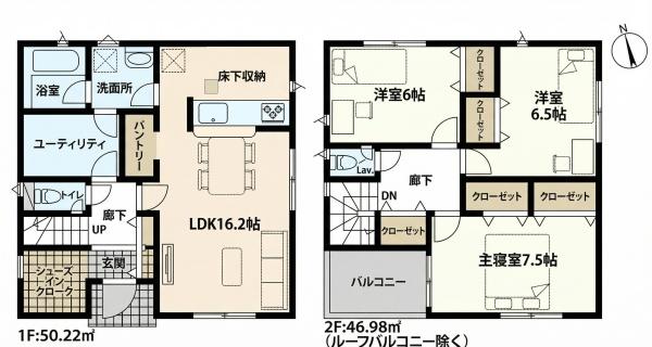 | 間取内容 | LDK16.2畳 1階 洋室7.5畳 2階 洋室6.5畳 2階 洋室6畳 2階 | ||