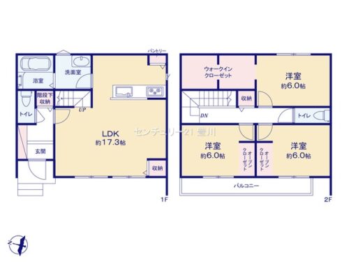 | 間取内容 | LDK17.3畳 1階 洋室6畳 2階 洋室6畳 2階 洋室6畳 2階 | ||