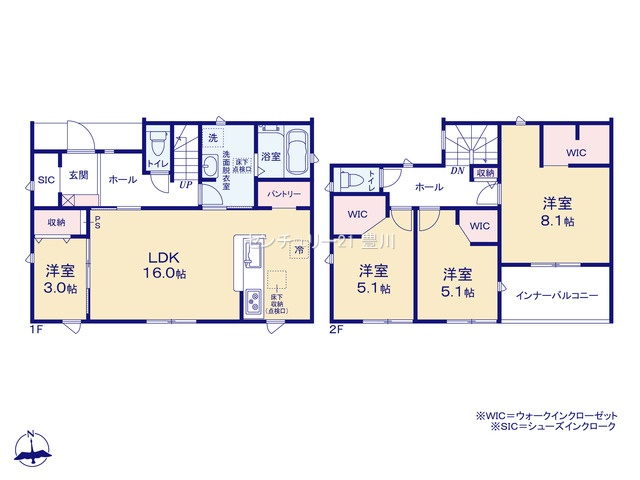 | 間取内容 | LDK16.0畳 1階 洋室3.0畳 1階 洋室8.1畳 2階 洋室5.1畳 2階 洋室5.1畳 2階 | ||