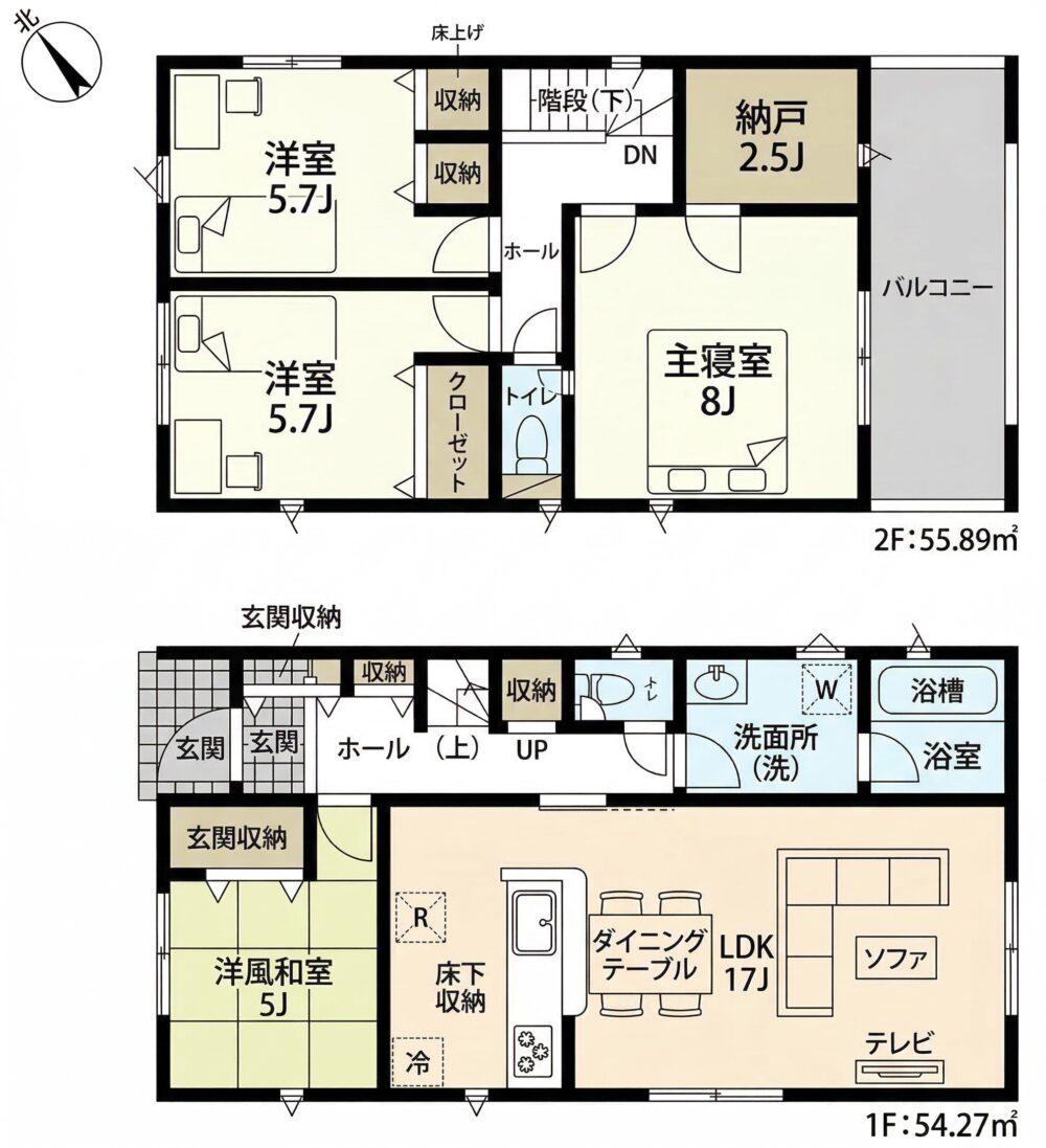 | 間取内容 | LDK17畳 1階 和室5畳 1階 洋室8畳 2階 洋室5.7畳 2階 洋室5.7畳 2階 S2.5畳 2階 | ||