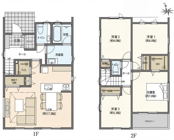 間取内容 LDK17.3畳 1階   洋室7畳 2階   洋室6畳 2階   洋室6畳 2階   洋室5.3畳 2階
