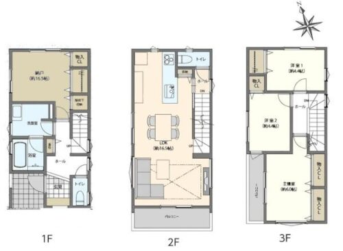 | 間取内容 | S16.5畳 1階 LDK16.5畳 2階 洋室6畳 3階 洋室4.4畳 3階 洋室4.4畳 3階 | ||