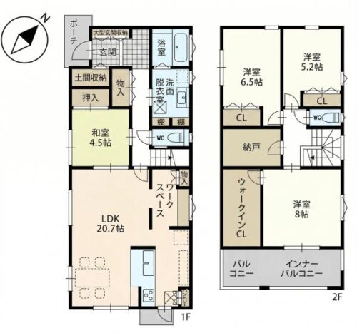 間取内容 LDK20.7畳 1階   和室4.5畳 1階   洋室8畳 2階   洋室6.5畳 2階   洋室5.2畳 2階   S2階