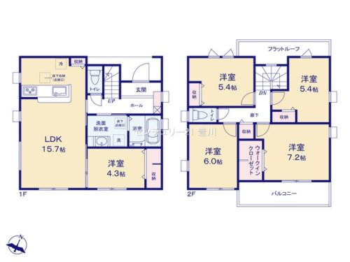 | 間取内容 | LDK15.7畳 1階 洋室4.3畳 1階 洋室7.2畳 2階 洋室6畳 2階 洋室5.4畳 2階 洋室5.4畳 2階 | ||