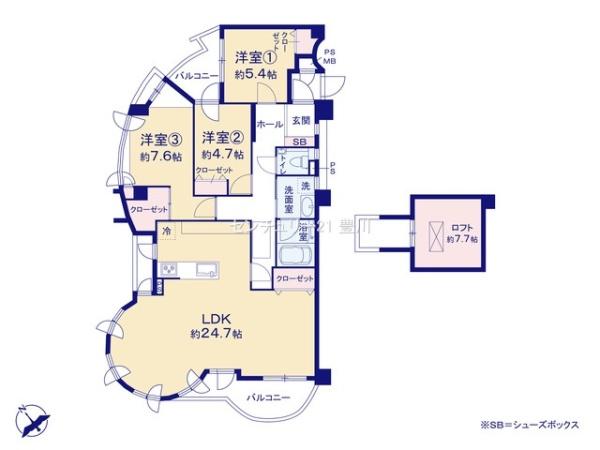 | 間取内容 | LDK24.7畳 6階 洋室7.6畳 6階 洋室5.4畳 6階 洋室4.7畳 6階 S7.7畳 7階 | ||