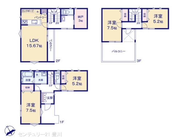 | 間取内容 | LDK15.67畳 2階 洋室7.5畳 1階 洋室5.2畳 1階 S3畳 2階 洋室7.5畳 3階 洋室5.2畳 3階 | ||
