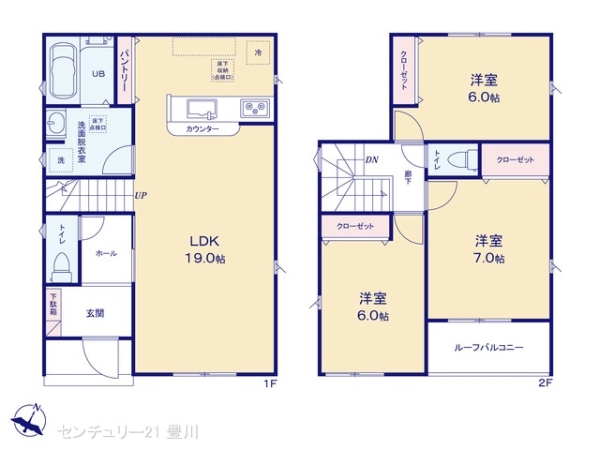 | 間取内容 | LDK19畳 1階 洋室7畳 2階 洋室6畳 2階 洋室6畳 2階 | ||