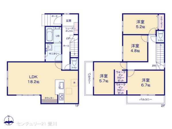 | 間取内容 | LDK18.2畳 1階 洋室6.7畳 2階 洋室5.7畳 2階 洋室5.2畳 2階 洋室4.8畳 2階 | ||