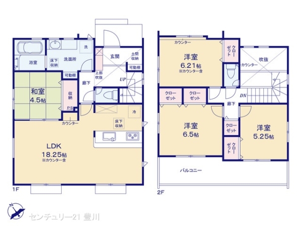 | 間取内容 | LDK18.25畳 1階 和室4.5畳 1階 洋室6.5畳 2階 洋室6.21畳 2階 洋室5.25畳 2階 | ||
