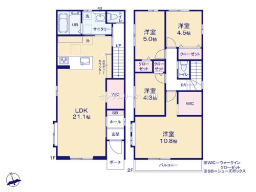 間取内容 LDK21.1畳 1階   洋室10.8畳 2階   洋室5畳 2階   洋室4.5畳 2階   洋室4.3畳 2階