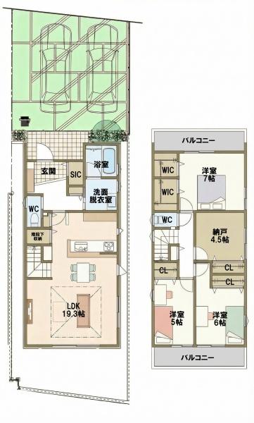 | 間取内容 | LDK19.3畳 1階 洋室7畳 2階 洋室6畳 2階 洋室5畳 2階 S4.5畳 2階 | ||