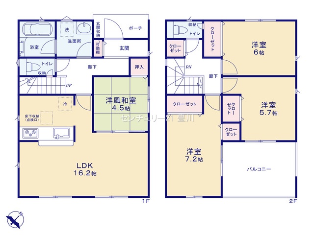 | 間取内容 | LDK16.2畳 1階 和室4.5畳 1階 洋室7.2畳 2階 洋室6畳 2階 洋室5.7畳 2階 | ||