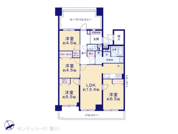 | 間取内容 | LDK13.4畳 洋室6.5畳 洋室5.5畳 洋室4.5畳 洋室4.5畳 | ||