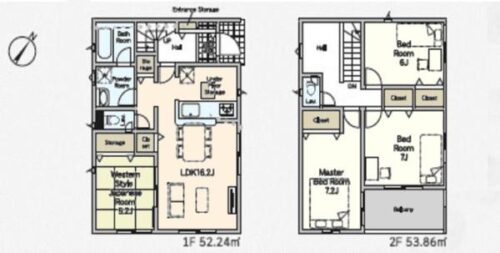 | 間取内容 | LDK16.2畳 1階 和室5.2畳 1階 洋室7.2畳 2階 洋室7畳 2階 洋室6畳 2階 | ||