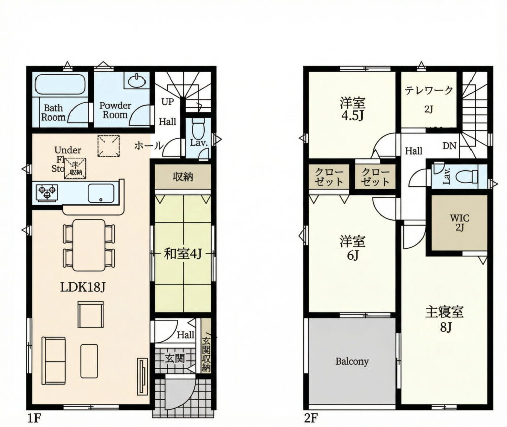 | 間取内容 | LDK18畳 1階 和室4畳 1階 洋室8畳 2階 洋室6畳 2階 洋室4.5畳 2階 S2畳 2階 | ||