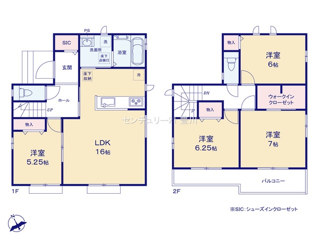 | 間取内容 | LDK16畳 1階 洋室5.25畳 1階 洋室7畳 2階 洋室6.25畳 2階 洋室6畳 2階 | ||
