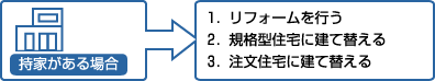 一口に一戸建てといっても、土地と建物を手に入れるまでの進め方にはさまざまな選択肢があります。たとえば、今の住まいをリフォームして住み続ける方法、建て替える方法、土地を購入して注文住宅を建てる方法、土地と建物がセットになった住宅を購入する方法など、ご状況によって選び方は変わってきます。